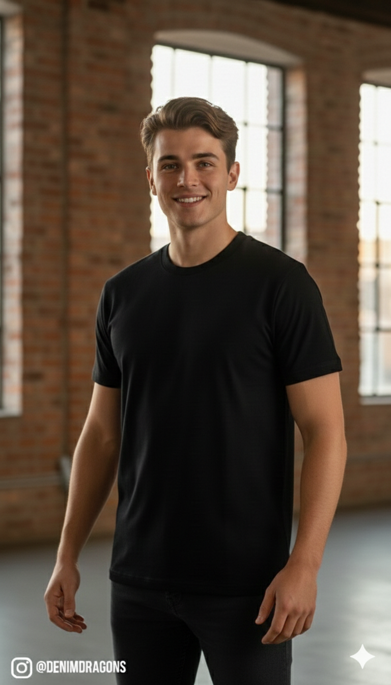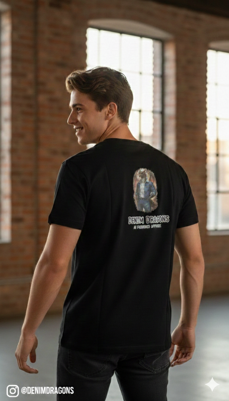 “Maak een statement met de Denim Dragons ‘Rebel’ collectie. Dit shirt combineert de mythische kracht van een draak met de tijdloze stijl van een denim jacket. Het unieke AI-ontworpen artwork knalt van het zwarte katoen af door de vurige details. Perfect voor wie niet bang is om op te vallen.”